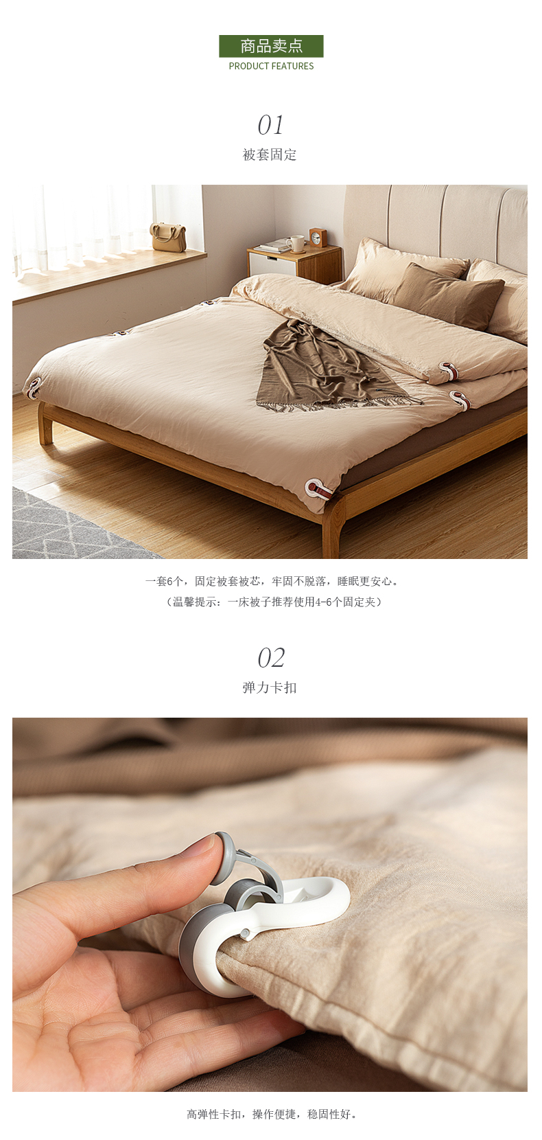 1、被套固定:一套6個,固定被套被芯,牢固不脫落